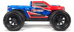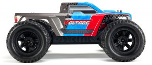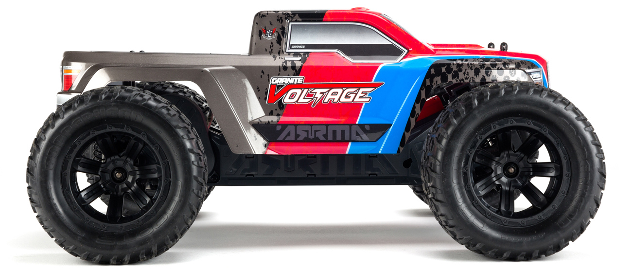 The Arrma Granite Voltage 2WD Brushed Mega Monster Truck is available in three different body colors: red/blue, blue/black and red/black.
