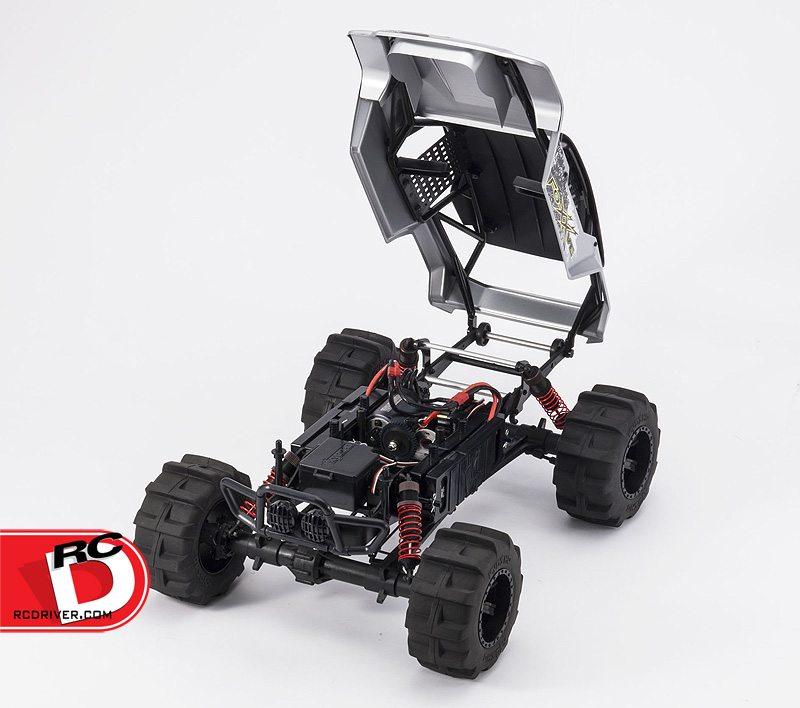 The FO-XX from Kyosho features solid casings on the front and rear rigid axles with oil filled differentials, a scale looking body with integrated roll cage and molded rooftop, a rugged bumper with integrated headlight buckets that are LED compatible, full ball bearings, low profile battery box, 17mm wheel hexes and flip top style body. It is compatible with the Mad Force series of parts and is delivered as an RTR.
