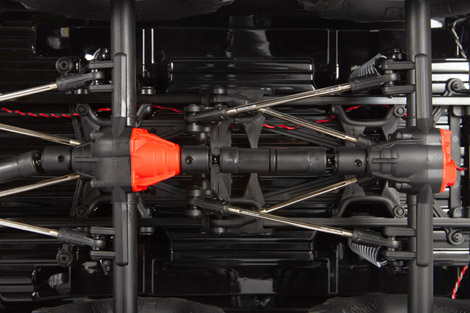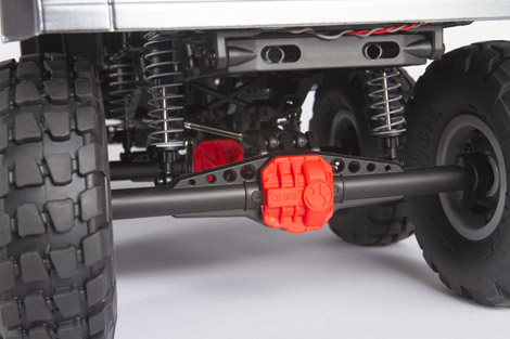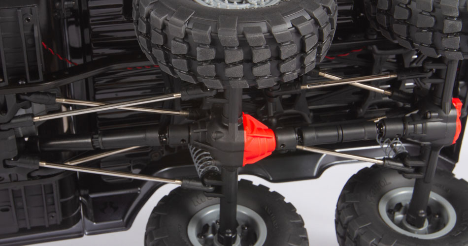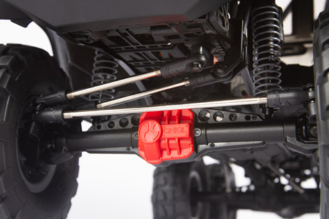 Just as a full-size truck has its steering block located on the frame, Axial places the mounting location for your servo on the chassis. The front suspension provides the correct steering geometry with virtually no bump steer.