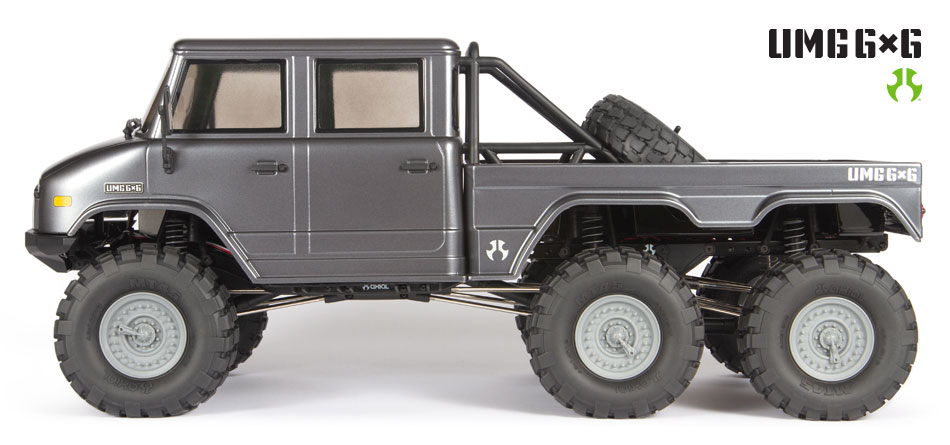 For extreme off-roading with more “Get me out of here!” grip, six wheels are better than four. See what new territory you can explore with the 1/10 scale Axial UMG10 6X6 RTR. Built around the proven SCX10 II chassis, the UMG10 6X6 delivers class-leading RC crawler performance in a convenient, ready-to-run package — only a battery and charger are required. The military-style body captures the look of full-size 6X6 trucks, with scale features that include 1.9 military-spec wheels and tires, a working spare, and built-in mounting positions for front and rear LED lights. The performance on dirt and gravel trails does thrilling justice to the vehicle’s full-scale, all-terrain inspiration. Waterproof electronics keep the action alive over snow, mud, and more. With its durable SCX10 II metal-geared transmission, rugged AR44 axles, full ball bearings, and more, the Axial SCX10 II UMG10 6X6 lets even first-time RC drivers keep on going when the going gets tough!