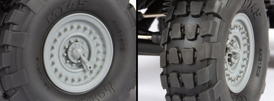 Six 1.9 MT45 tires, molded in sticky Axial S30 compound rubber, keep the UMG10 6X6 crawler on course and climbing difficult terrain with ease. Their big block, symmetrical tread pattern provides plenty of grip to get over steep obstacles. The tires are mounted on injection-molded, 3-piece, MW19 beadlock wheels that offer the perfect scale look for a military build. A functional spare tire is also included.