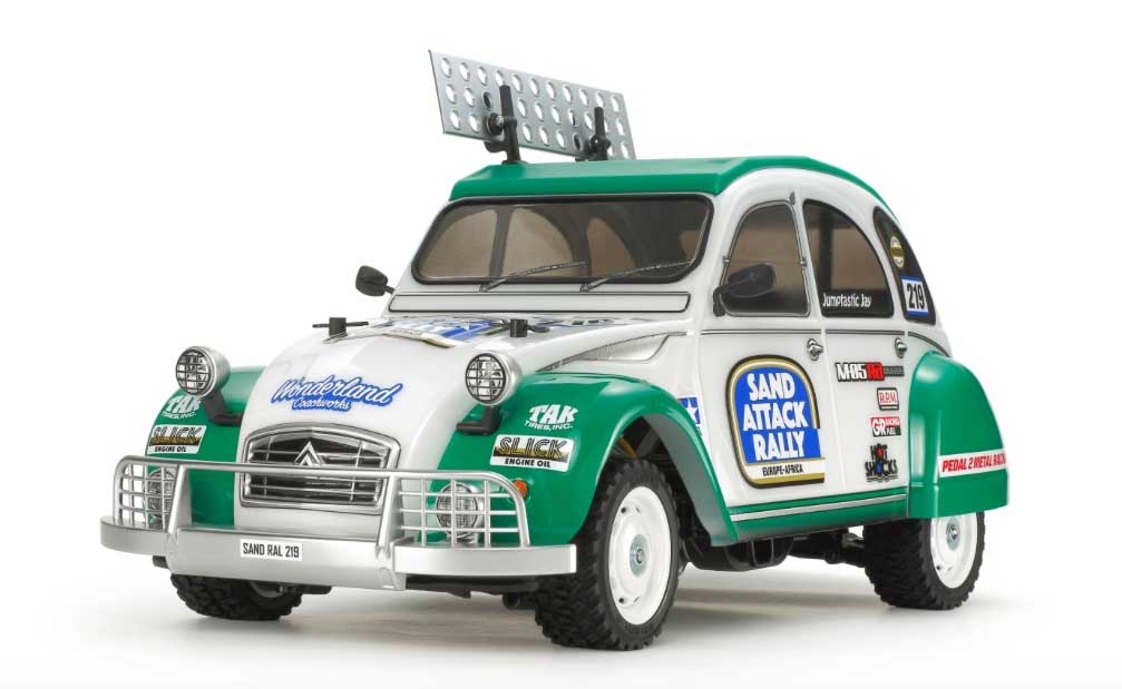 A variation of the Citroen shown above, the Citroen 2CV Rally is a highly realistic recreation of the full-size car that competed in rally racing across Europe. The polycarbonate body comes with a separate bumper, side mirrors and a recovery ladder with hold-down roof mount. Underneath sits the dedicated rally chassis, the M-05Ra. The rally-tuned M-05Ra chassis features a lightweight, narrow, durable, and an easy-assemble semi-monocoque plastic composite frame. The 4-wheel independent double wishbone suspension is equipped with specially designed hub carriers and front and rear uprights to increase ground clearance by 5mm. The front skid guard, side guards, and rally block tires are also included to allow you to enjoy both gravel and tarmac driving. A 540 brushed motor with the Tamiya TBLE-02E speed control provides the go for the rally Citroen.
