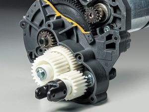 When you are looking to upgrade your RC whether it be the G 500 highlighted here or any other, pay attention to the critical components that are constructed of plastic because they could be a weak spot on the vehicle. The CC-02 Aluminum Spur Gear Mount is a replacement for the stock plastic mount that comes with the G 500. Since it is machined out of aluminum, the rigidity is welcome over the plastic and it increases efficiency in the drivetrain. This optional mount is designed to be lightweight and is anodized a cool gun metal color. Tamiya includes the hardware, pins and shims so that you can precisely install it onto your CC-02 chassis.