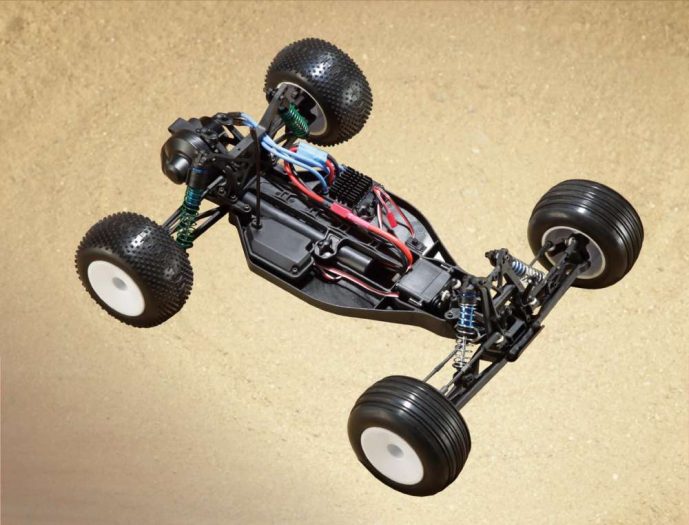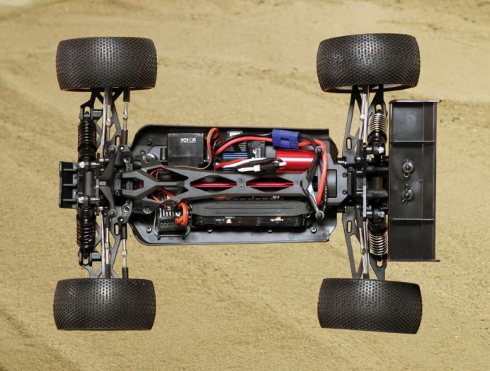 Small, fast, loaded with features found on much larger vehicles, and ear to ear fun, that is what the Mini 8IGHT–T from Losi is all about. This 1/14-scale vehicle is a scaled down version of the 1/8 version of the electric 8IGHT-T and as such, costs only $279.99 and is delivered as a ready-to-run. The backbone of this pint sized machine is an aluminum plate chassis and it features a shaft driven 4WD drivetrain. Metal geared diffs are found at both the front and rear gear boxes and are super tough. While the spur gear is plastic it is well protected by a convenient gear cover. As for power, that is taken care of with a Dynamite 4500Kv brushless motor and waterproof ESC that is both 2S and 3S compatible. For phenomenal control, Losi gave the Mini 8IGHT-T a Spektrum DX2E V3 transmitter and AVC enabled SR4200 receiver. The oversized 2.2” Blockhead tires are mounted on standard sized 2WD 1/10-scale buggy rims and feature a 12mm wheel adapter. The cab forward body with rear wing looks great and helps generate downforce to keep all four of the tires planted to the ground.