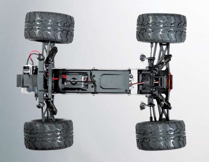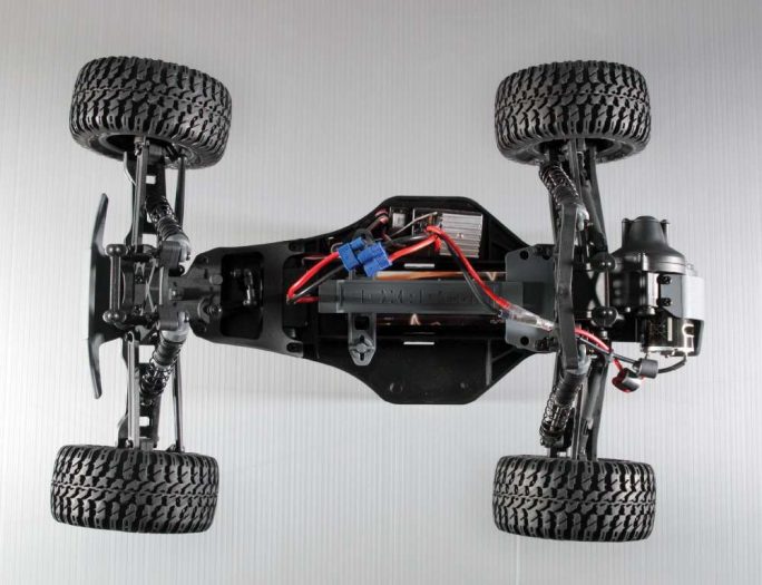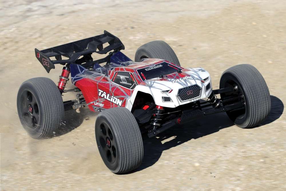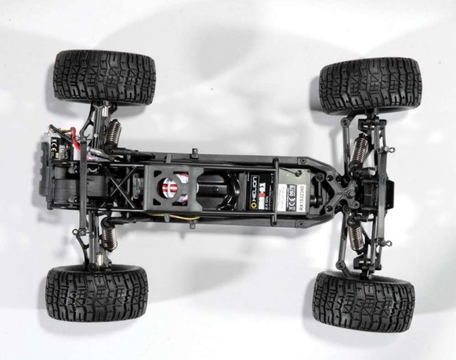 OK, the Talion is probably the most expensive truck on our list costing $479.97, but there is a good reason for that; it’s ultra-tough, big, and can hit 60 mph when used with a pair of 3S LiPo battery packs. It comes with a waterproof 180-amp rated ESC that is paired with a 2050Kv red anodized motor with heat-sink can, has a beefy 3mm thick aluminum plate chassis, plush 16mm big bore shocks, very adjustable pillow ball style front end assembly, sharp looking five-spoke wheels with dBoots tires, and a metal geared steering servo that has plenty of torque. Realizing a truck like this needs to be built tough to withstand such