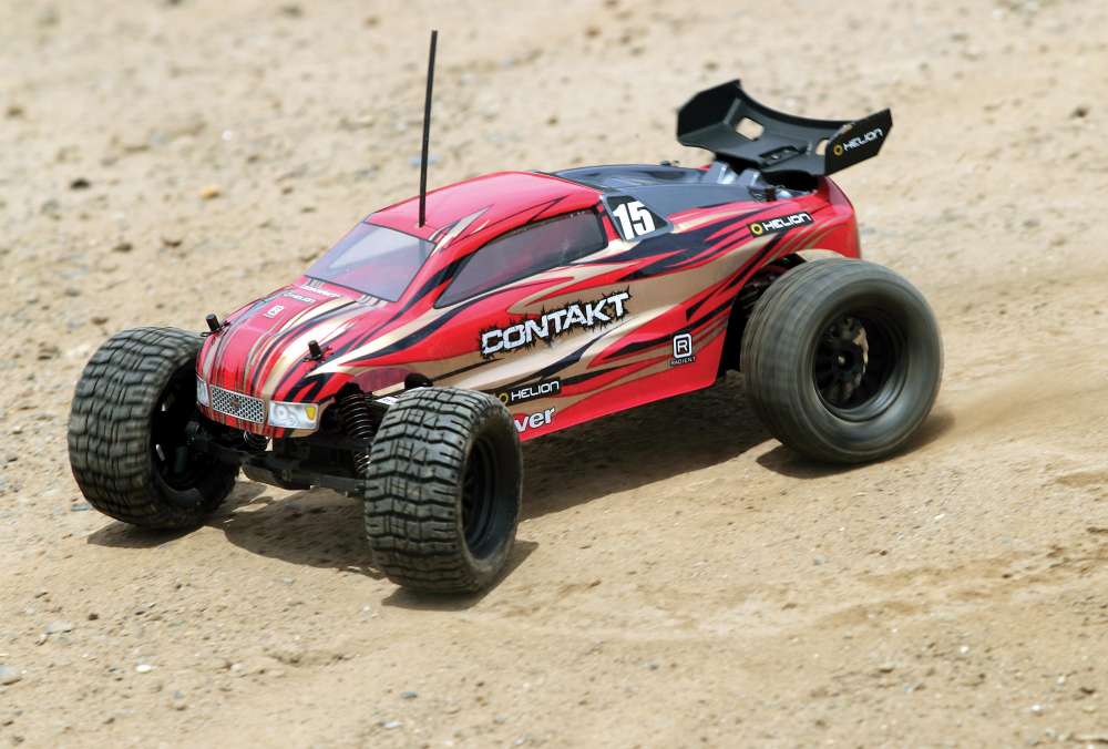 OK, not too fast, not too slow, and a cool look with nice features. This is how I’d describe the Contakt 12TR mini truggy from Helion. This 1/12 2WD tiny terror comes with a go-anywhere waterproof electronics package that features an all-in-one ESC/receiver unit, 390 sized brushed motor and 1500mAh LiPo battery pack that help it reach speeds of 15 mph. All of the plastic components are made from engineering grade composites, helping make it super durable, the all-terrain high grip tires are made from a long wear compound so they will last a long while even if used on rough asphalt and come pre-mounted on cool black mulit-spoked rims. Available in blue and red, it is well priced at only $129.99 and all you need to add to the Contakt 12TR to get going are four “AA” batteries for the transmitter.