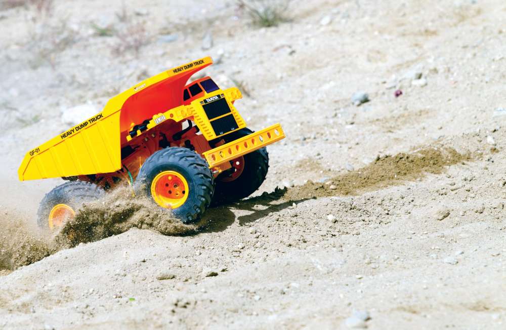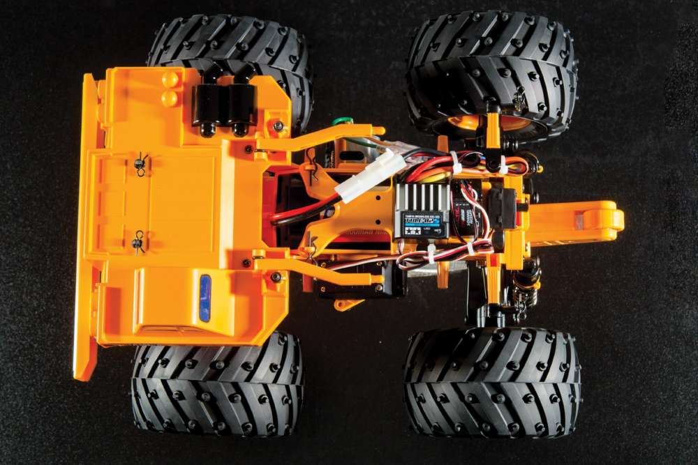 If you liked smashing around Tonka trucks when you were a kid you’ll absolutely love the Heavy Duty Dump Truck from Tamiya. The yellow body on this dumper is made from injection-molded ABS plastic so it is plenty tough and has a movable rear bed for raised and lowered positions. The GF01 chassis, which also has many yel- low details, features fully independent double wishbone suspen- sion, a torque tuned motor that is centrally located for easy wheel- ies, and a gear driven 4WD drivetrain. Other cool features include a spring mounted front bumper, wheelie bar, and large chevron style tread tires mounted on, you guessed it, yellow rims. This cool kit costs about $144.99 and will need the addition of a radio sys- tem, battery pack and steering servo.