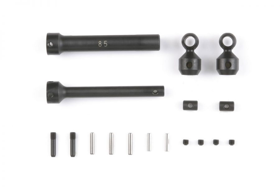 It is a given that universal shafts will give an RC vehicle better performance over a dogbone setup. The Front Assembly Universal Shafts that Tamiya created for the CC-02 chassis will replace the stock front drive shafts and the wheel axles found in the steering knuckles. Instead of the dogbones, universal joints are utilized which will rotate without binding even when the steering is full lock in either direction. Like the optional Rear Drive Shafts, these Front Assembly Universal Shafts are constructed of carbon tool steel for superior rigidity.
