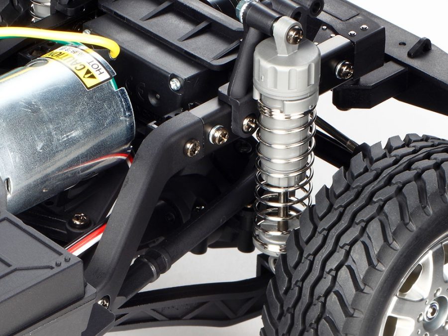 Most of the time when we are recommend oil-filled aluminum shocks is due to the fact that the vehicle in question comes with friction shocks that clearly hinder off-road handling. This time around the vehicle in question, the Mercedes-Benz G 500, comes equipped with oil-filled shocks albeit plastic ones. These stock shocks can do the job of soaking up rough terrain while keeping the CC-02 settled, but appearance wise, they fall short. They are molded in a dull gray color and have a toy-ish look that hurts the super-realistic scale look of the G 500 body. These are not just one of Tamiya’s aluminum shock sets. This damper set comes with narrower shock bodies with a shiny aluminum finish that look much more realistic than the stock units. Each damper is crafted from lightweight, precision aluminum to give excellent operation. Ball connectors are used on both ends to keep smoother roll motion. Nearly everything is included to get these shocks assembled including the shock oil. What is remaining is the springs and the stock ones can be used or the dedicated shock springs (item #54992).