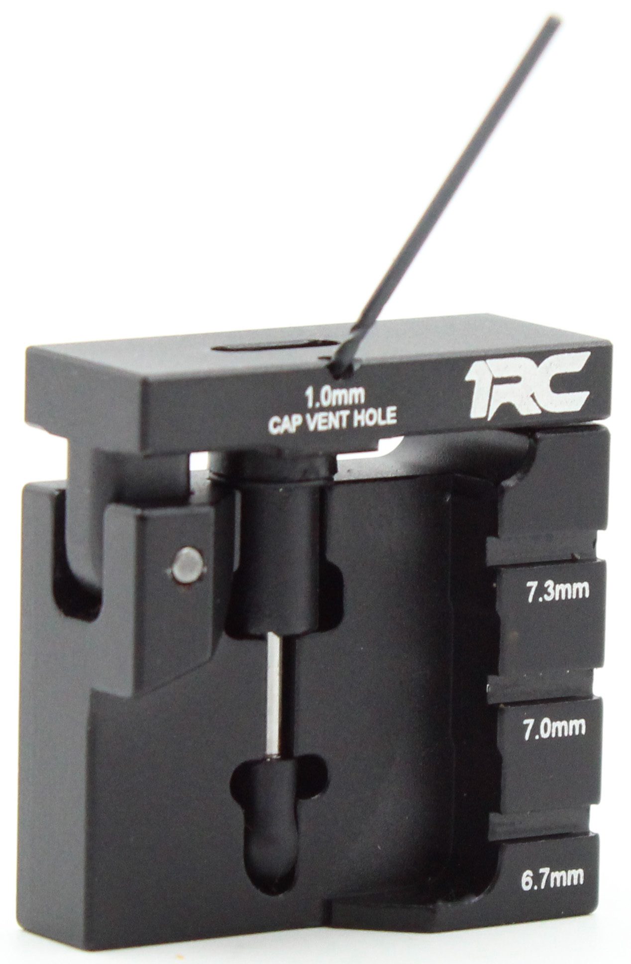 1RC Racing 1/18th Racer Kit And Pit ToolsThe 1RC Racing Shock Assembly Tool is an essential accessory for anyone looking to enhance the performance of their 1RC Racing Car. This new tool is compatible with all 1RC Racing 1/18th shocks and is built from durable 6061 aluminum. It features a sleek black anodized finish and laser-etched markings. This versatile tool serves multiple functions. It allows you to easily install and vent shock caps using the included 1mm drill bit and aluminum guide. Additionally, the Shock Assembly Tool lets you adjust the shock length to our recommended settings of 6.7mm, 7mm, and 7.3mm, using the included flat blade screwdriver. You can fine-tune the down travel to ensure that all four shocks are equal in length, ultimately providing optimal performance for your vehicle.to ensure that all four shocks are equal in length, providing optimal performance.