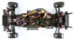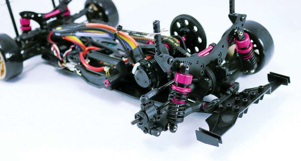Other than a few interesting pieces, a drifter’s suspension is very similar to a touring car’s. A single A and D mount and separate B and C mounts are used, both having dual support screws and stamped, metal shims to raise them up. The suspension arms have droop screws, anti-roll bar mounts and adjustable wheelbase shims. The rear suspension uses vertical ball studs to handle camber and roll while the front uses an interesting, dual pickup front Y-arm setup. This system allows the adjustment of camber, caster and roll and swings smoothly on upper and lower pivot balls. It’s actually quite unique and allows for some extreme camber settings.