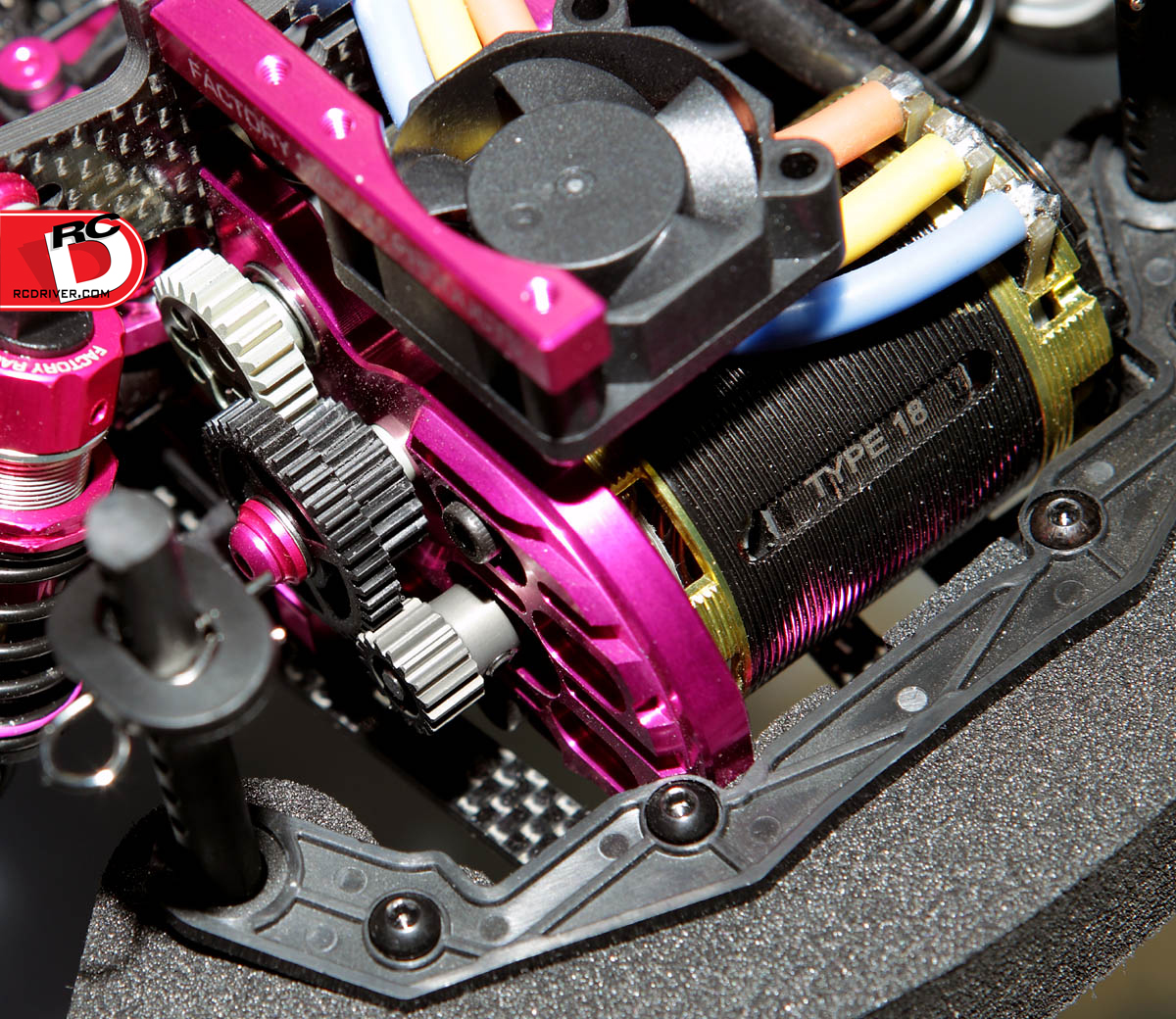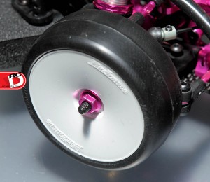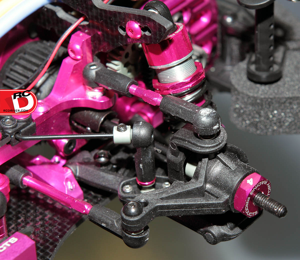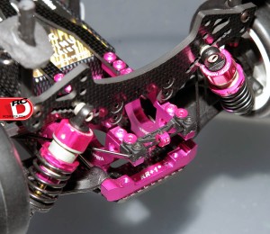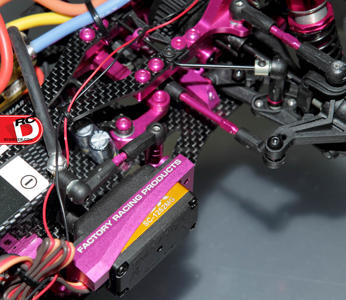 – The FF2014 is designed to utilize a low profile steering servo. To secure the Savox SC-1252MG servo I had on hand a pink anodized aluminum mount is employed. Standard dual bellcrank steering system with an upper carbon fiber brace attaches to the main chassis plate and rides on ball bearings for smooth side to side action.