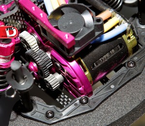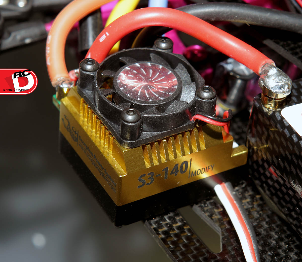 – The layout of the FF2014 is clean and simple. The battery is located down the centerline of the chassis, is held in place by the upper deck and can be moved forward or backward to aid in tuning. I mounted a Scorpion Vanguard S3-140 ESC to the left hand side of the chassis while the steering servo and receiver are on the right side. Up front, I mounted a quick Scorpion RS-3420 13.5T Motor. Right above the motor is an integrated cooling fan mount to help keep the motor operating efficiently. As for a fan, I went with a 3Racing 30mm x 30mm x 10mm High Speed Cooling Fan.