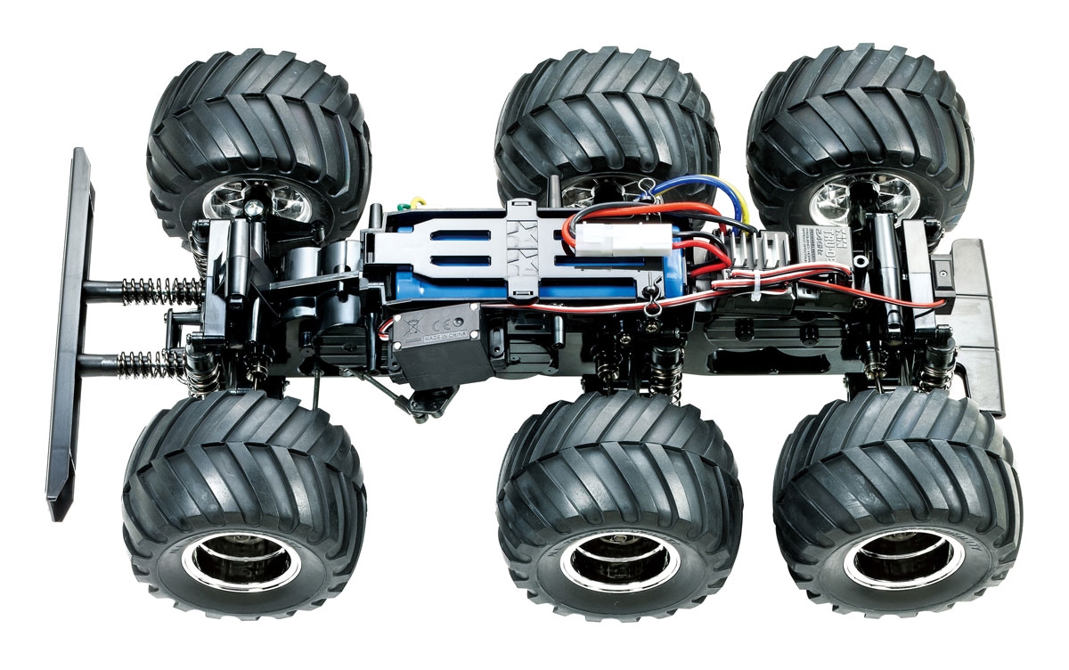 In order to help the Konghead 6×6 corner more smoothly, Tamiya employed three robust gear differentials fitted with metal outdrives. Mounted on the right side of the chassis behind the front wheel is a Tamiya 540 brushed motor that drives all six wheels. An independent double-wishbone suspension setup is utilized for each of the six wheels and tires using a lower H-arm and a fixed upper link. Providing the damping are six friction shocks attached to each H-arm. Mounted on the upper left side of the chassis is the steering servo with 2-piece adjustable steering link setup. The overall design of the Tamiya G6-01 chassis makes for a very tough vehicle that will be right at home on all types of terrain.
