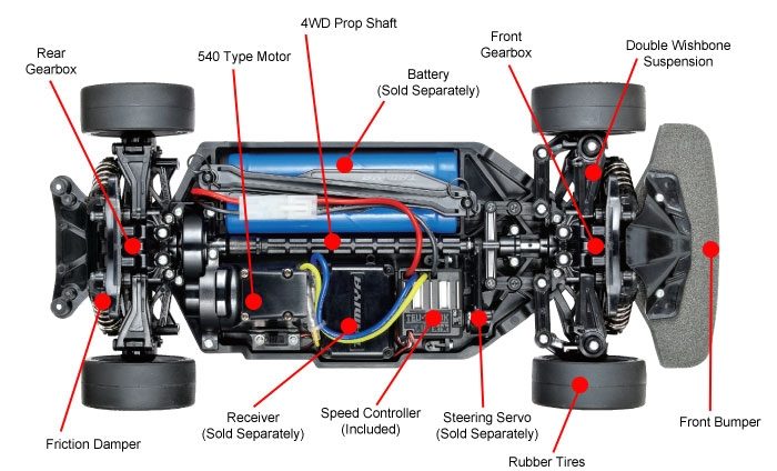 Like its predecessor, the TT-01, it utilizes a shaft drive system for full time 4WD which is a proven setup and is used on numerous Tamiya kits. Tamiya designed the chassis with cornering and overall speed improved over the TT-01 chassis and ensured that it can take full advantage of the new electronics available. Once you have mastered the TT-02 in its stock form, its overall performance can be increased by adding the numerous hop-up option parts available from Tamiya as well as ones offered by aftermarket manufacturers.