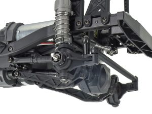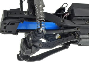 At each of the corners, you will find 4-wheel double wishbone suspension that uses lower H-arms and a fixed upper link. Providing stability are plastic body oil-filled shocks that are mounted between the lower suspension arms and integrated shock towers. Steering is controlled by a servo that is mounted on the left side of the chassis with an adjustable link that actuates a center bellcrank that in turn controls two adjustable links attached to the steering knuckles.