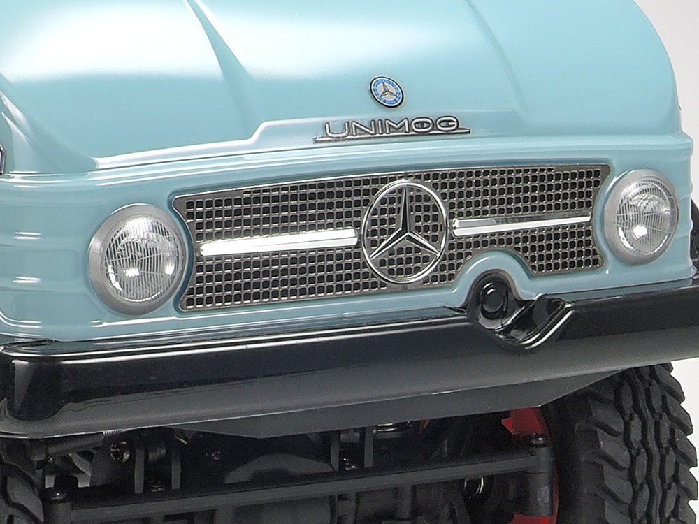 The body comes unpainted so that you can add your own personal touch to make it your own. Extra realism is created with separate parts like a fuel tank, ABS molded side mirrors and metal plated front grille and emblem. As an added bonus, Tamiya includes the TLU-01 LED Light Unit so that you can illuminate the front headlights and rear brake lights. The last touch to complete the tough appearance of the Unimog are red ABS truck wheels that are designed to look like beadlock rims and are wrapped with block pattern rubber tires.