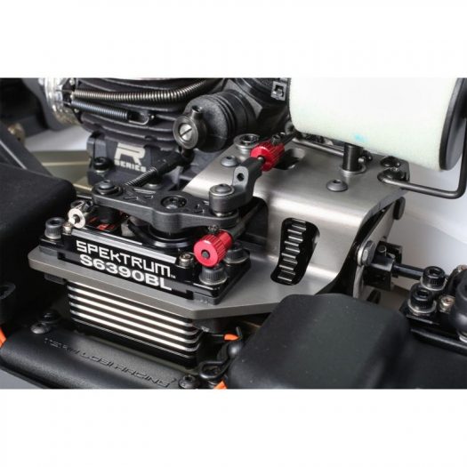 The chassis width has been increased to aid in stability and to give the buggy a more neutral feel and new chassis side guards are improved and fit onto the chassis better. The weight has been moved forward in the chassis to provide a better driving balance and cornering. The lightweight large footprint engine mount aims to reduce flex underneath the engine to eliminate chassis fatigue on high traction race surfaces.