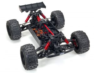 The extra-rigid, laser-etched, anodized aluminum chassis plate has a multi-structured center brace system, rear lower chassis brace and strong composite chassis side pods for the durability to support extreme stunts. Extra-thick molded composite front and rear shock towers hold massive 20mm bore, oil-filled adjustable shocks to soak-up bumps and jolts.