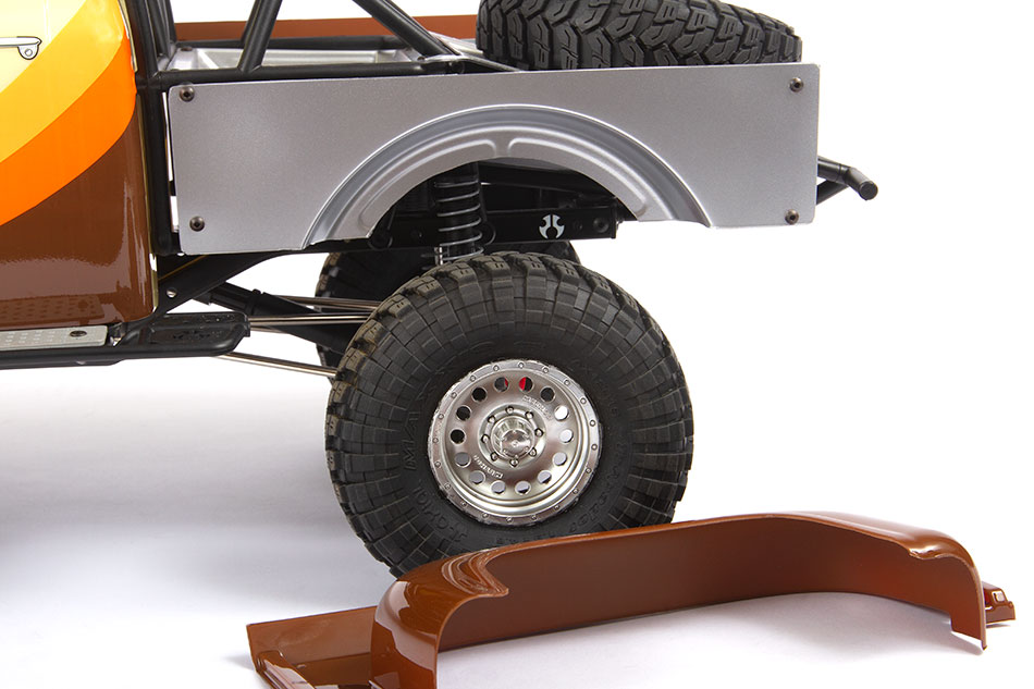 By creating the bed from four pieces instead of as one, Axial® engineers have given it much greater depth. The inner bed panels have the appearance of bead rolled aluminum sheet metal, just like the real thing. Also included is a functional spare wheel and tire. For a more “truggy” look, the rear fenders can be removed.