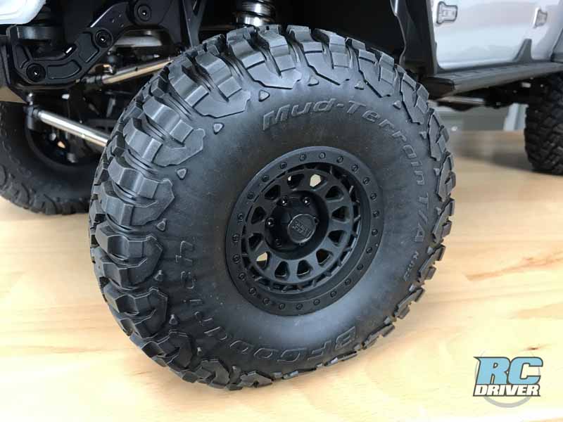 This rig arrives in a massive box and the rig is secured inside in styrofoam. You have two color choices for this scale machine, silver and green and we’re happy with our silver 4×4. The beast comes ready to run, built, electronics installed, painted, detailed and all you need to do is install radio batteries, the main pack and supply a charger. But you probably figured all that out and the fact that it is 6th-scale by Axial’s designation. This rig rolls on some massive licensed BFGoodrich Mud Terrain tires wrapped around Black Rhino style wheels.