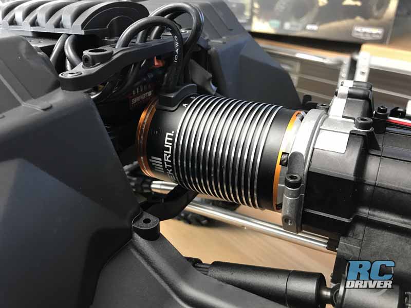 We’re sure you peeked at the photos already. How about the size of that motor! It’s a 1200KV sensored motor! That means much smoother control. It mates up with a Spektrum Firma 120A programable ESC that is also Smart compatible. A high-torque metal gear servo handles steering and a stand servo is used for the shift system. A Spektrum DX3E with thumb steer lever is included and allows you to monitor the battery charge from the meter on it’s face as long as you use a Smart battery.