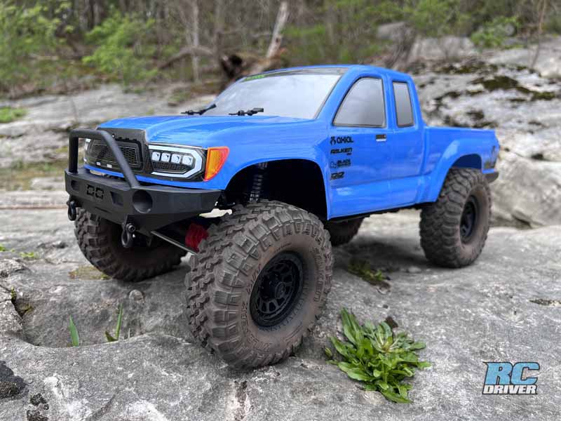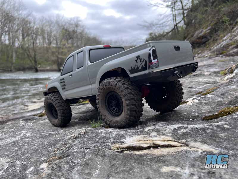 The body on the Base Camp is a sinle piece lightweight almost Toyota like shell but not licensed. The rig is however equipped with a licensed Demello front bumper which has a flat face for better approach angles. A matching rear bumper and neat Axial graphics ties the look together.