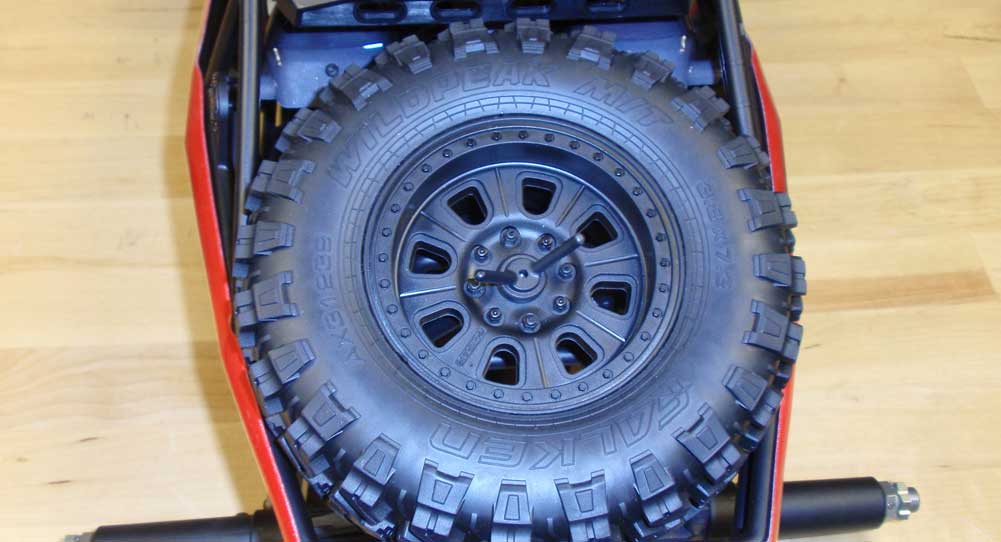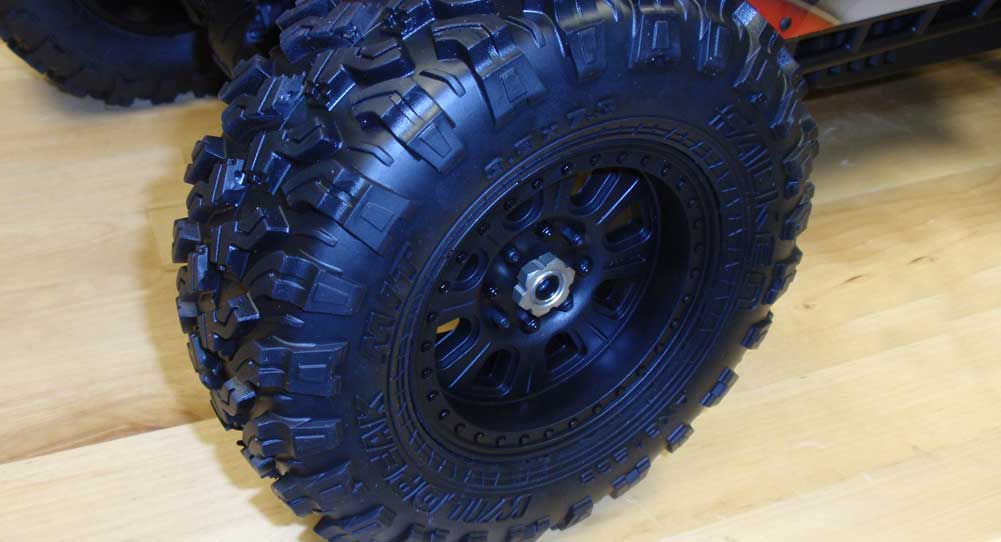 Fit the tires to each corner and secure with the wheel nut. Notice the wheel nut is knurled on one side; face that side towards the wheel.