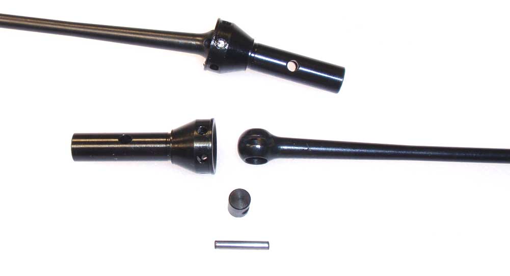 Using the thinner pins, build a pair of front CVD axles. Install the barrel into the axle ball, install that into the stub axle, align the holes and insert the pin. Remember to use a little black grease on the axle ball to keep things lubricated.