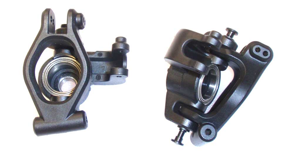 Attach the left caster block to the left steering knuckles, the right to the right. The pivot pins drop into place but will fall back out so keep them in until the next step. Note the orientation of the parts together.