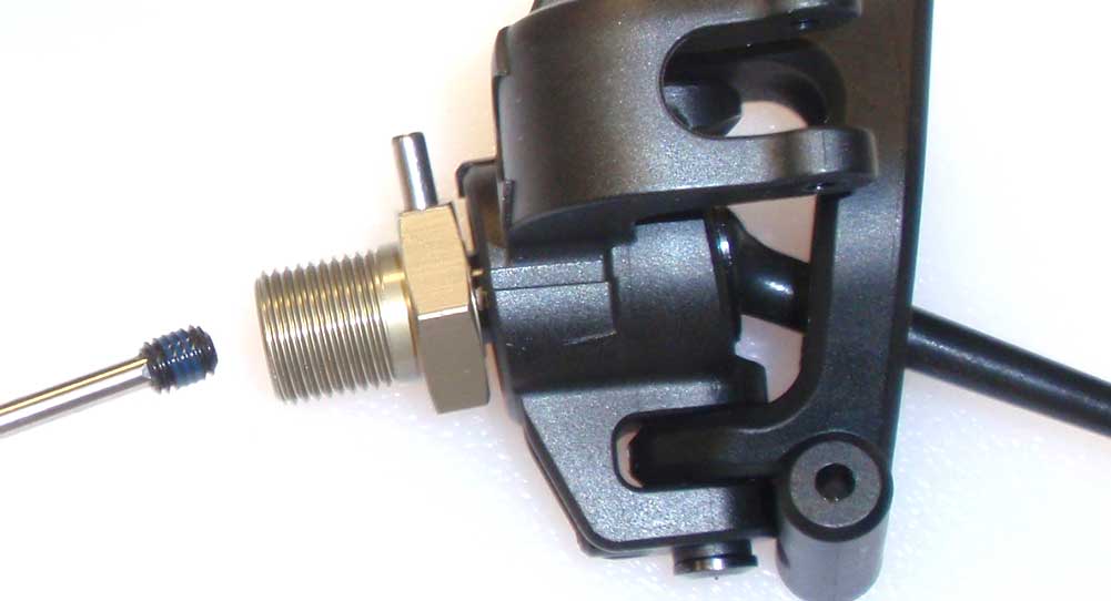 Feed the M3 set screws into the steering block as shown and SLOWLY tighten until you feel them snug up. Give a tug on the pivot pins to make sure the set screw has secured them; if not, tighten the set screw another 1/4 turn. Do not overtighten these!
