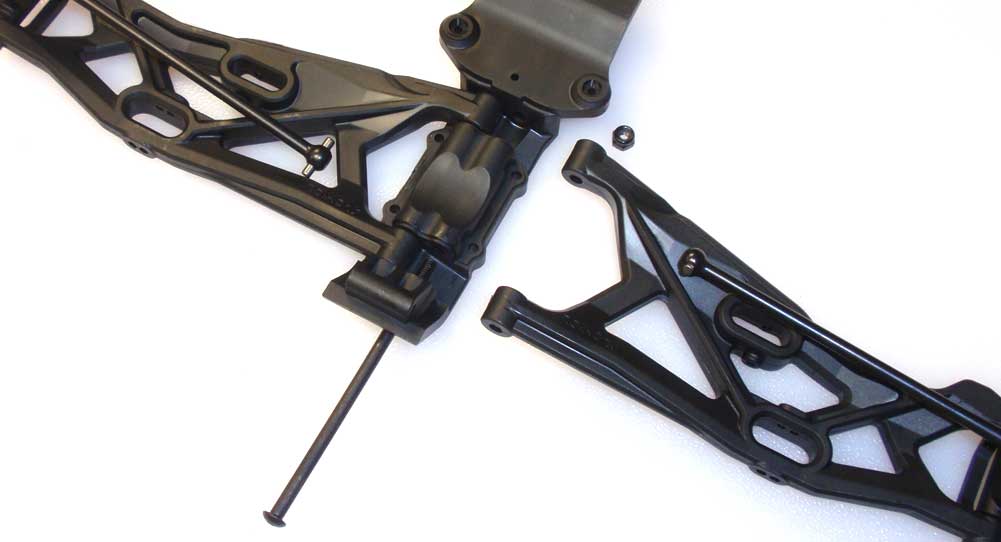 Slip the front suspension arms into the front bulkhead. Slide the hinge pins through to capture the suspension arms and secure with the M3 lock nut. Holding onto the lock nut when snugging up the screw can get a bit tricky, so have a pair of needlenose pliers handy to help out.