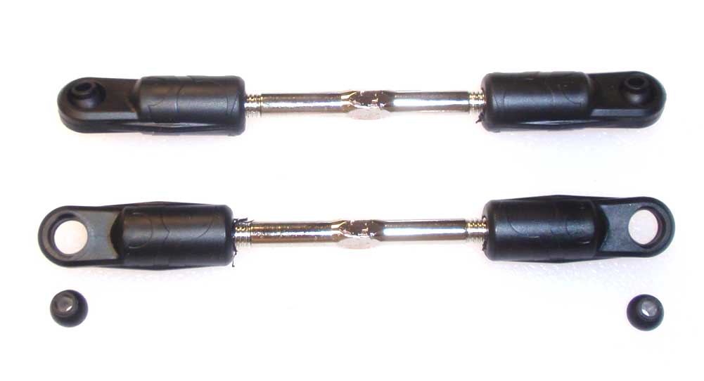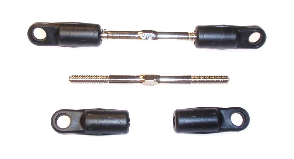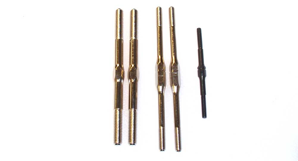 We’re going to be attaching the front camber links now, but here’s a quick pic of the three types of turnbuckles. The rods on the left are for the camber; put those aside because we’ll be using them in the next step. The rods in the middle are for the steering and the single, black rod is the draglink.