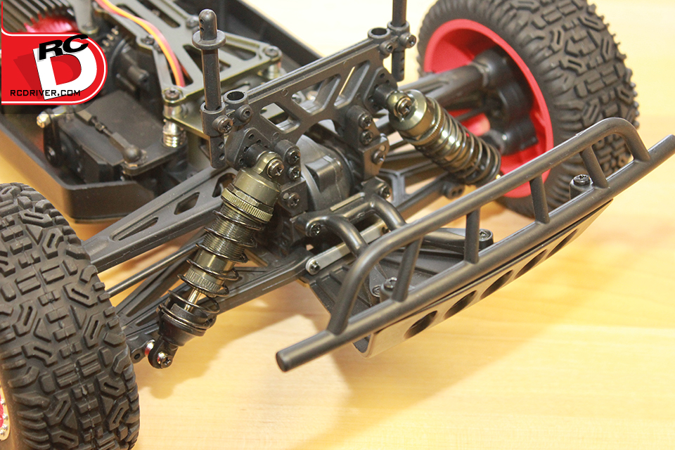 Oil filled aluminum shocks feature threaded collars to adjust preload. The bumper has some flex to absorb impacts.