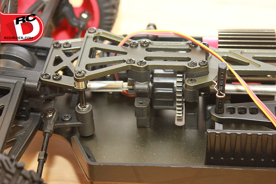 The center diff features a steel spur gear and a stubby aluminum center shaft sends power to the front gearbox.