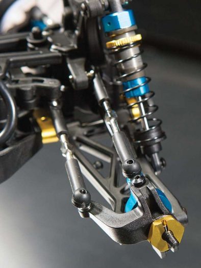 • Very high quality, all aluminum, oil filled shocks are included with the Pro versions of the BZ-444. The shocks look good and felt ultra smooth. Composite A-arms, composite shock towers and composite steering knuckles make up the plastics of the suspension and all have a solid feel. What was really nice to see were aluminum hinge pin pivots for all four inner arms. What was even cooler were the aluminum caster blocks to support the steering knuckels. Fully adjustable turnbuckles front and rear round out the very complete factory upgraded suspension package.