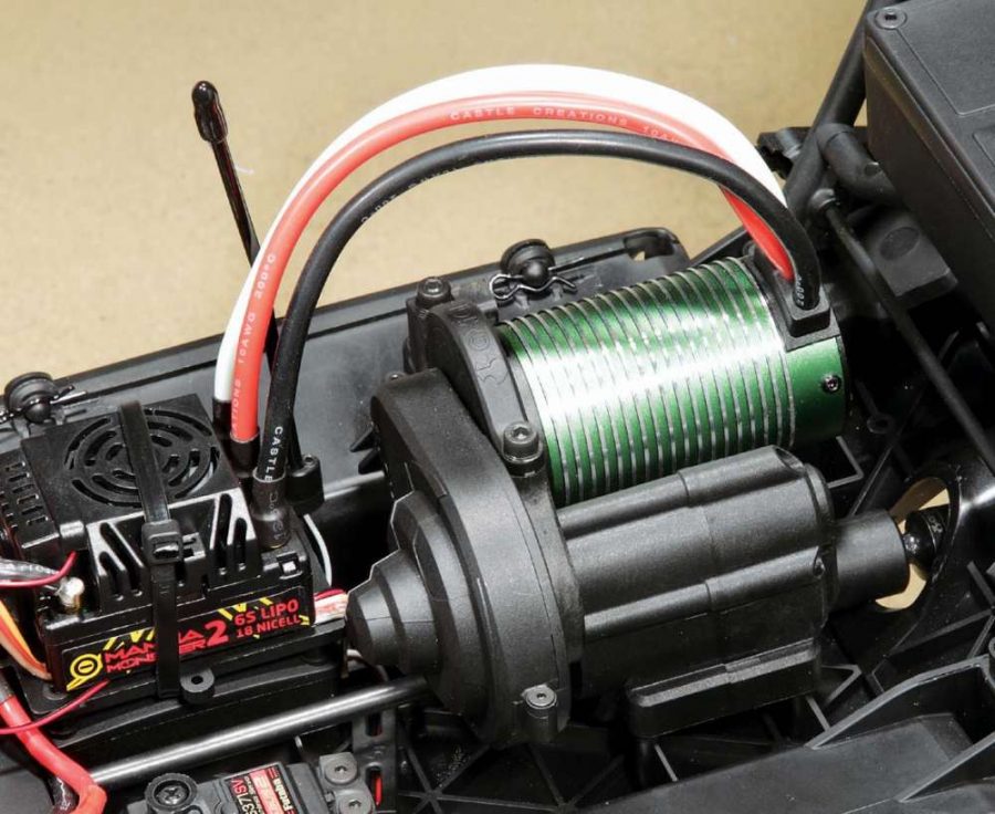 If you’re going to make it bigger and give it more power, you’d better have the drivetrain to support that decision. Axial has loaded up their center transmission with all-metal gears, full ball bearings and a 32P spur gear that is captured by a dual-pad slipper clutch. The pads have also been upgraded to metal and offer some pretty impressive gripping power. The motor mounts are high and to the right of the transmission which, to me, looks rather elevated in the chassis. I’m not sure this is such a big deal though; normally you’d worry about that in smaller vehicles but the Yeti XL is so big it makes this 1512-Series Castle motor look like a thimble. Axial has also hit the upsize button on the drive bones, increasing the front and rear bones to 4mm, the center/front bone to 5mm and the center/ rear slider to a whopping 17mm! Tim the Toolman would be proud of those numbers!