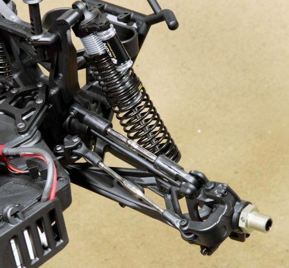 The steering system consists of a dual bellcrank setup that uses an integrated, non- adjustable servo saver. The servo saver spring is captured in a cool little ‘cage’ that helps set and keep the tension. The servo mounts straight to molded chassis posts with the draglink running through a little tunnel under the top deck. The servo looks a little puny in the massive chassis and will probably be doing a lot of work, so I’m going with Futaba’s powerful BLS371SV S. Bus2 Programmable servo. This guy pumps out a happy 264oz./in. of torque which should be plenty to keep this behemoth pointed in the right direction.