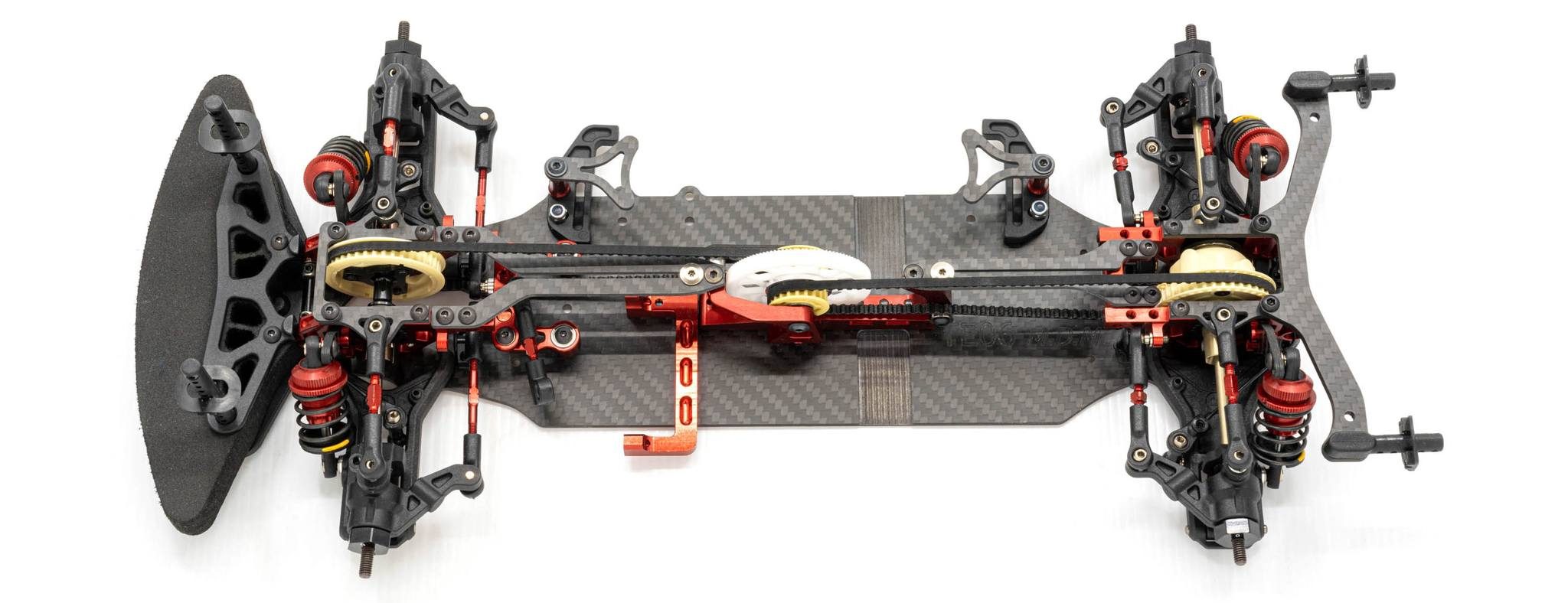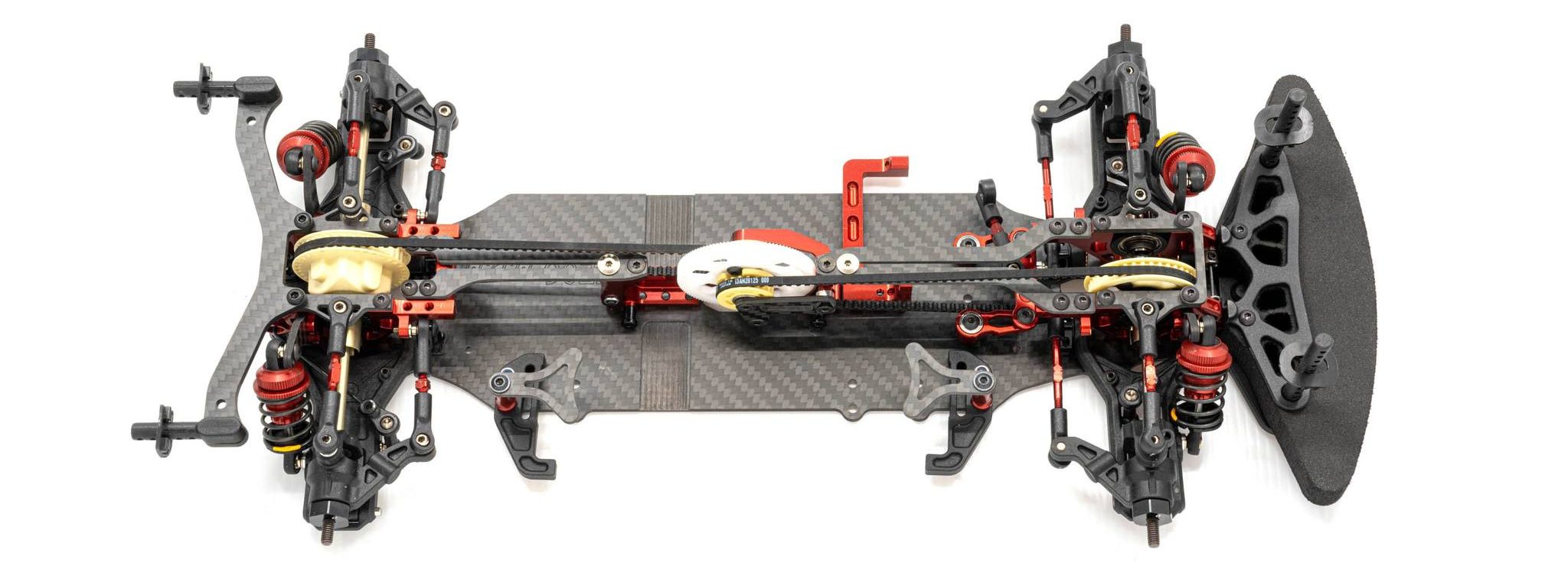 Special to the TE-06 is its shock dampers, noticeably short and placed in an unusually low position, fixed to newly designed composite suspension arms. The distinctive detail of the aluminum parts, among which the motor support stands out, presenting itself as a true masterpiece, anodized in Capricorn red. Completing its innovative features is the dynamic Toe-In system located on the rear axle.