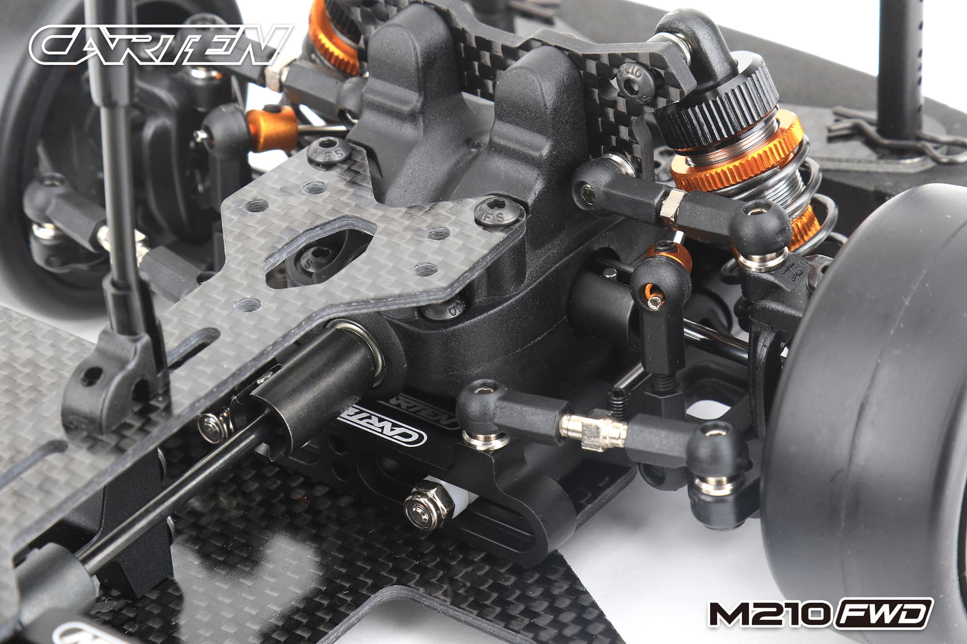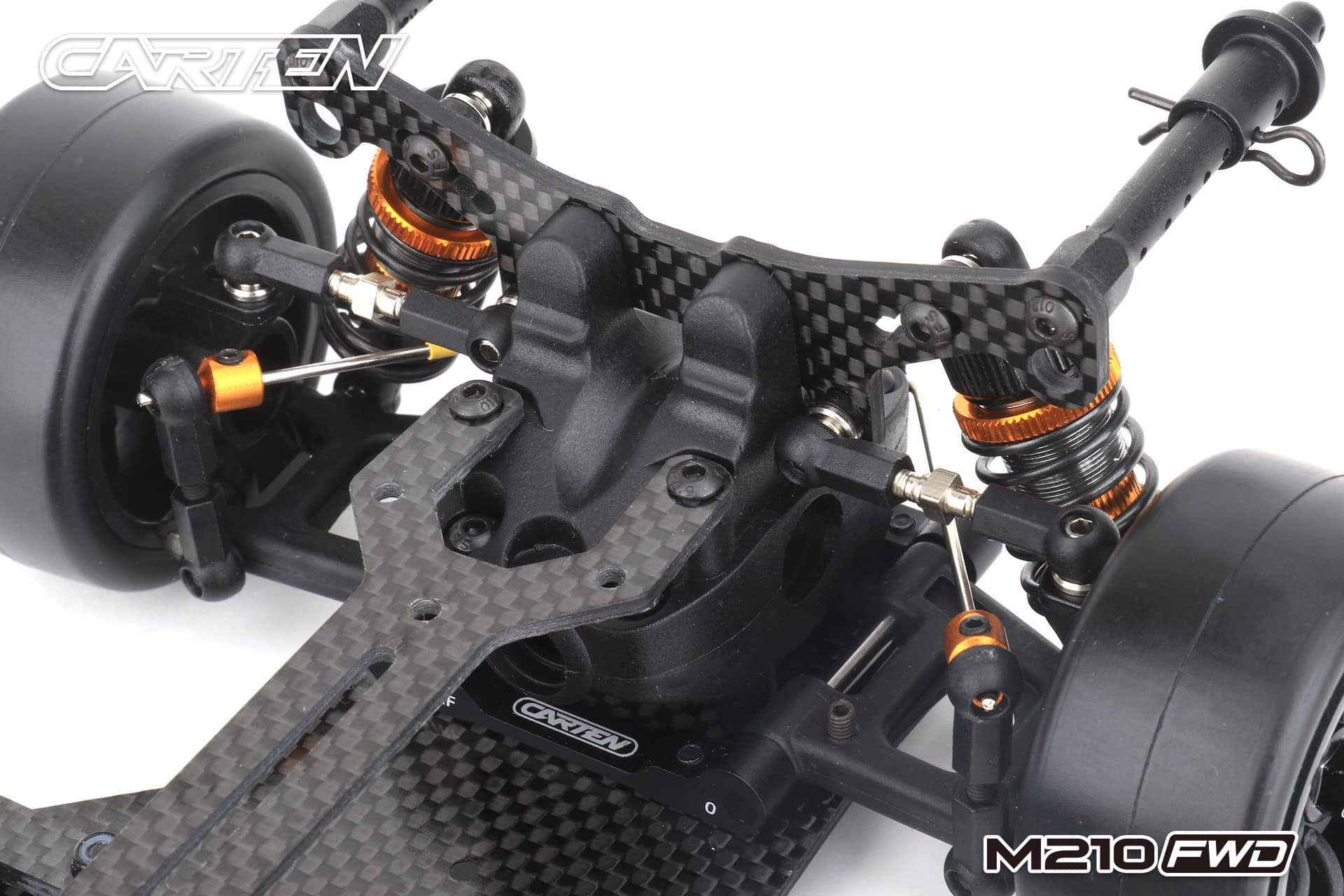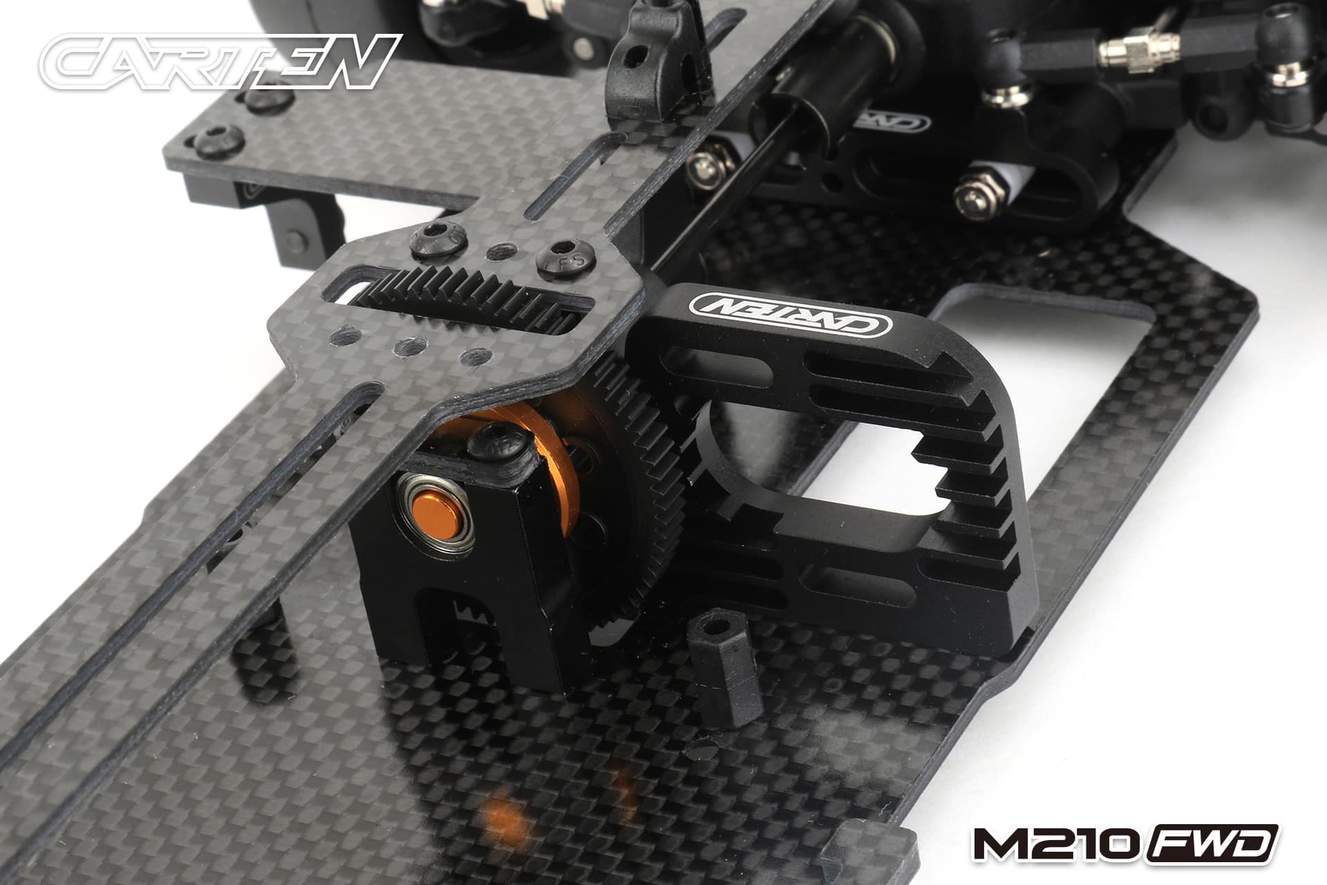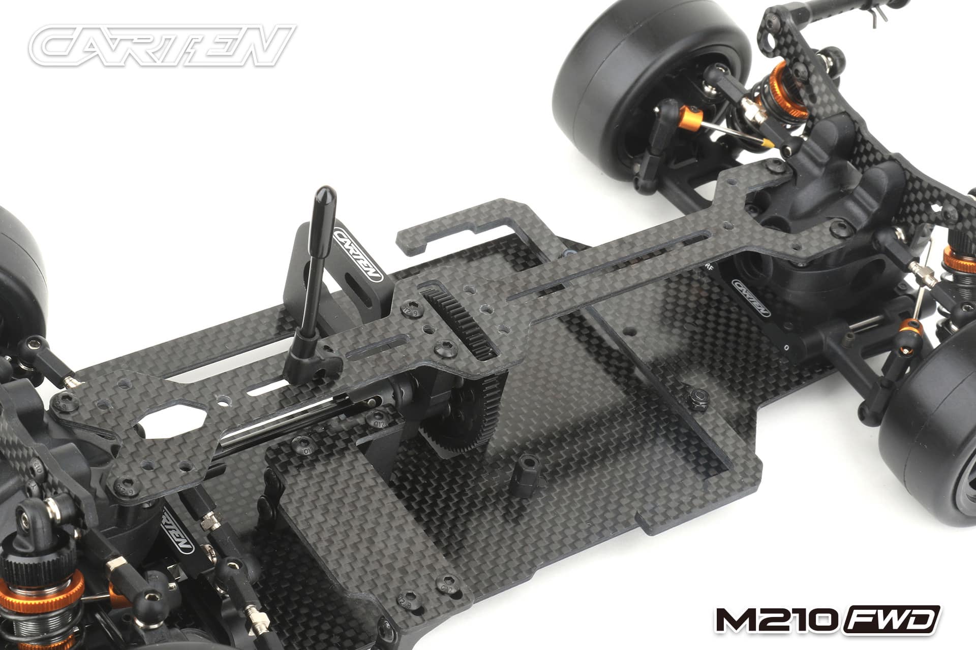 The Carten M210FWD competition touring car kit is based on the M210R touring car, but developed for competitive FWD racing. This chassis uses a front motor layout to get the best weight distribution. The shaft drive enables a very low friction drivetrain. This is supported by ball bearings in every part of the drivetrain and ball differentials ensure that a perfect set-up is possible for all track conditions.