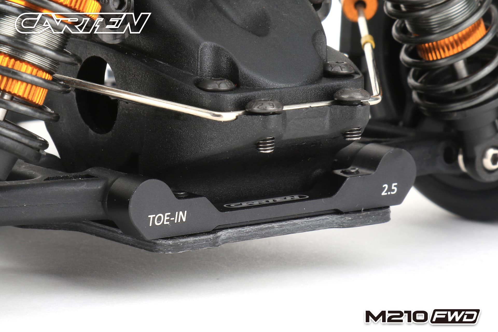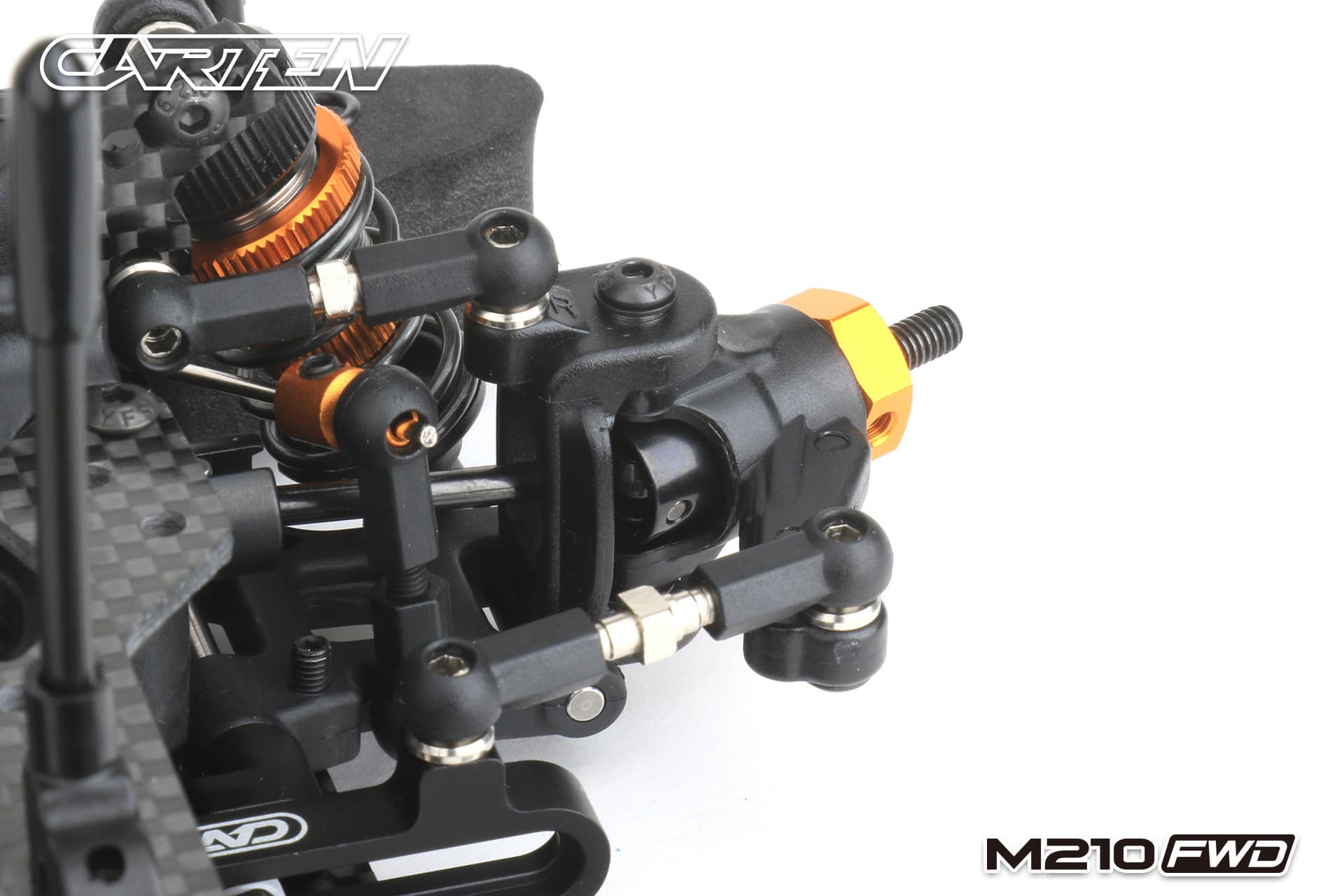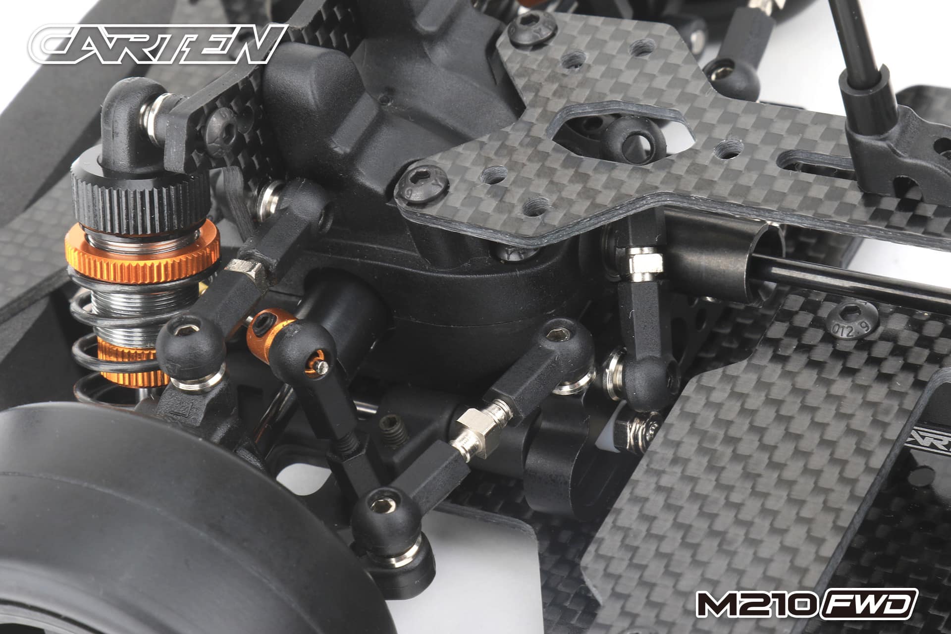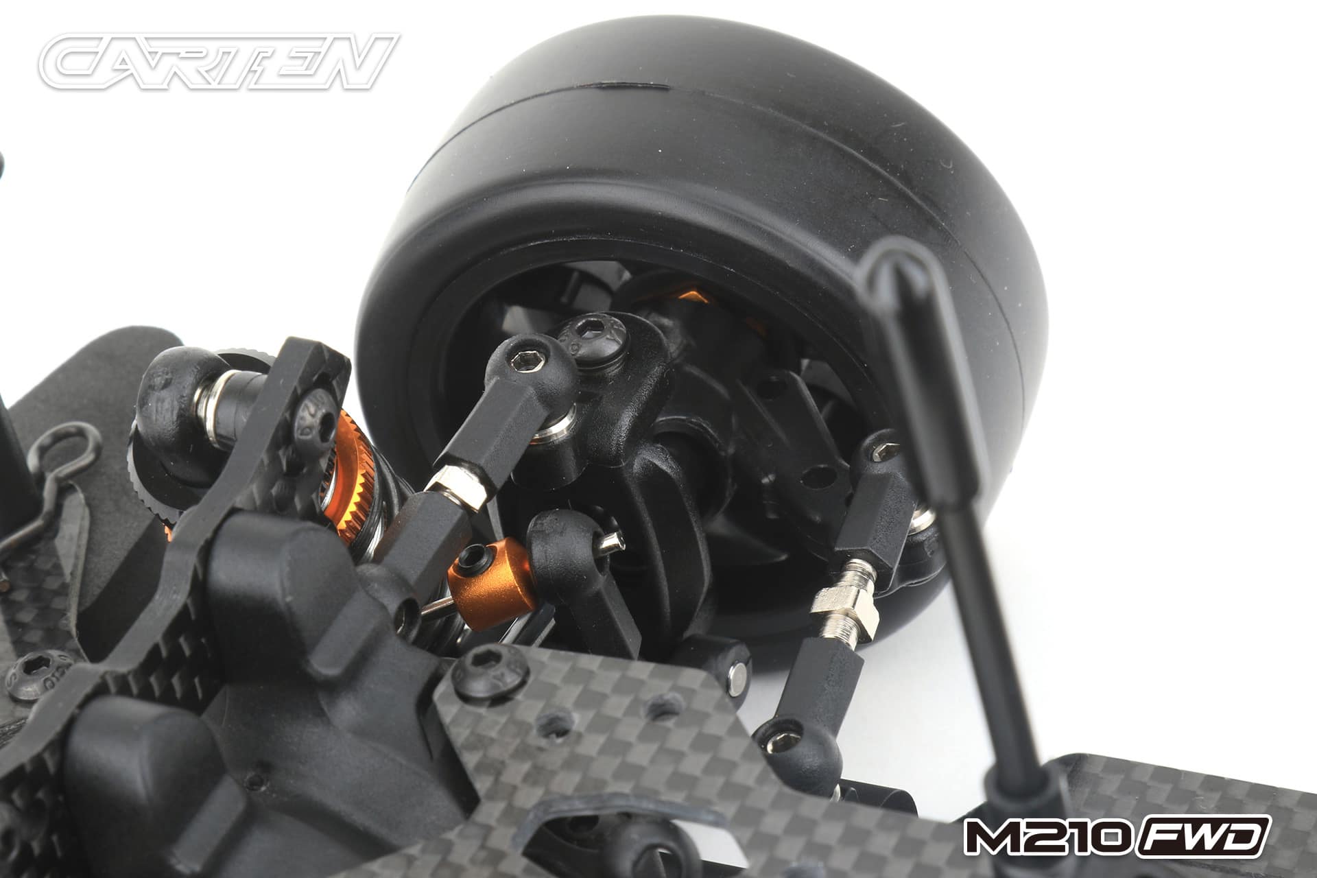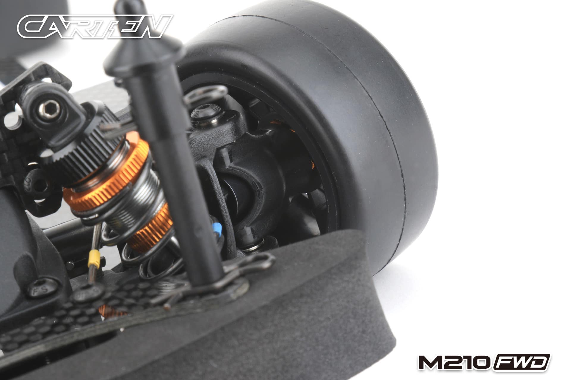 The Carten M210FWD competition touring car kit is based on the M210R touring car, but developed for competitive FWD racing. This chassis uses a front motor layout to get the best weight distribution. The shaft drive enables a very low friction drivetrain. This is supported by ball bearings in every part of the drivetrain and ball differentials ensure that a perfect set-up is possible for all track conditions.