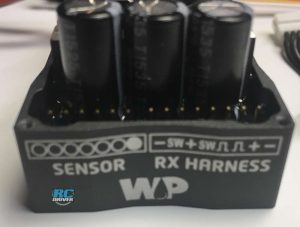 Inside the cool box you’ll find the Castle Creations Mamba X Sensored Brushless System, Mamba X Series Driver’s Ed Guide, Mamba Micro X Quick Start Guide, a cool decal sheet and redeemable coupon for a free Castle Link or for $10 a Field Link Tuning Card. On one end of the Mamba X there are the red and black power wires waiting for a connector of your choosing and three, 4.0mm female bullet plugs for the A, B and C motor wires to plug into. The opposite side features the X series wire harness that includes a receiver plug wire, power wires for the cooling fan, white aux wire and red/black wires the extend to a waterproof on/off switch. Next to this harness is the adapter for the sensor wire plug.