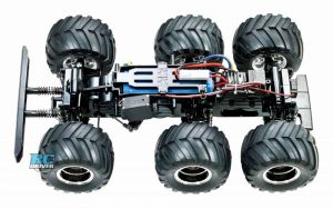 · The 6WD chassis employs 3 differential gears to transmit power from the front-center-mounted motor to all of the model’s wheels. These differentials are encased in the durable main chassis.