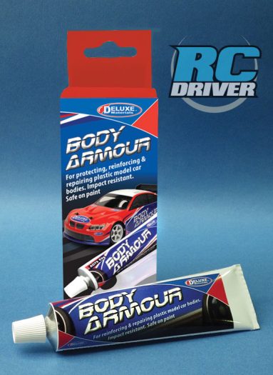 Deluxe Materials Body Armour is a highly flexible polymer adhesive specially designed for reinforcing & repairing model car bodies subject to the arduous conditions of model car driving and competition. Its specially designed flexible & tenacious formula makes it ideal for protecting & repairing splits, tears & holes in model car bodies, thus preserving & prolonging the integrity and life of the car body shell. Body Armour should be applied to the critical areas, e.g. fenders, wheel arches etc with a spatula or finger. A smear of liquid soap will ease surface contouring & smoothing.
