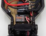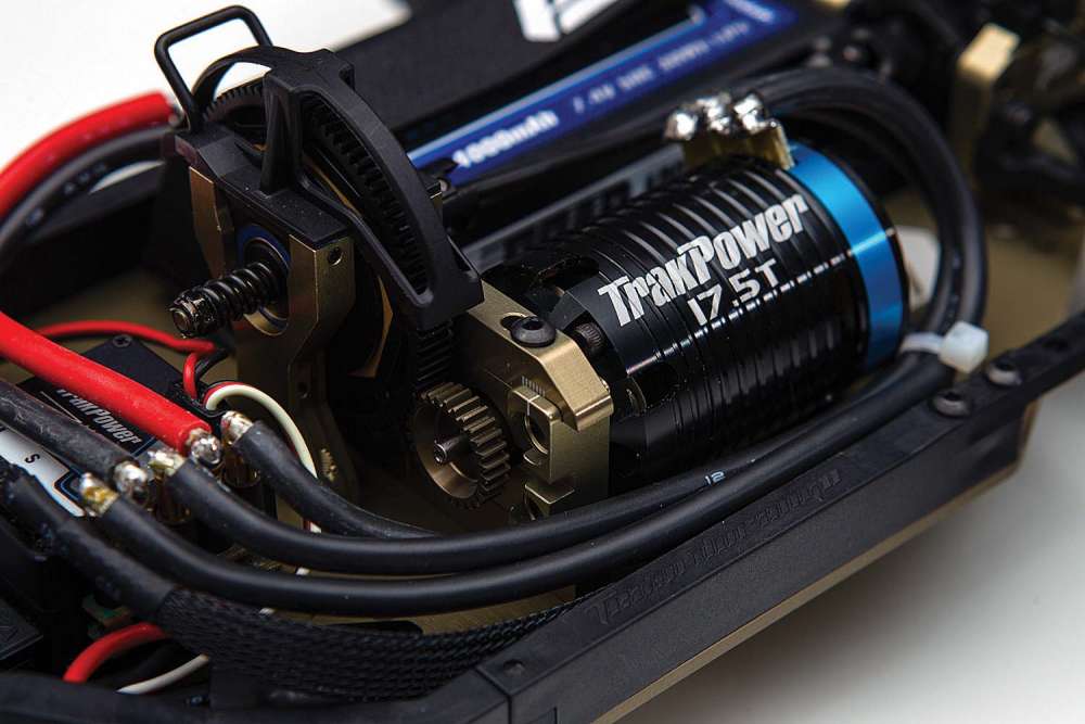 ‹ At first glance at the F with its body off, you think you are looking at a shaft driven 4WD car, but it’s just from the center diff back. Aluminum center plates support the slipper assembly. A machined aluminum motor mount slides in and out to adjust gear mesh. Once the mount is on the chassis it is a bit difficult to get at the lower motor screw unless you have a 2mm ball hex driver. A universal driveshaft sends power to the rear gear differential. TD includes two shafts depending on how you set up the motor battery configuration. The rear diff features composite internal gears, metal bevel gears connected to the outdrives and a metal ring gear. The diff can of course be tuned with optional oils. The universal shafts to the wheel axles are Durango’s multi-axle shaft design that allows you to adjust the plunge point to alter steering response in corners. The driveline features sealed bearings too.