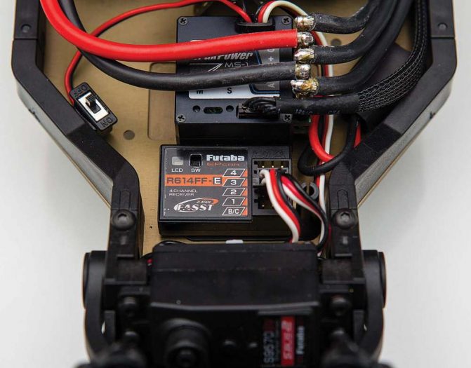‹ The body on the F is narrow up front and widens out to cover the wide mid section of the chassis. The cab is semi-forward and aero- dynamic with three slight fins at the back to control air flow. We sent our shell off to Larry at Kustom RC Graphics for some awesome paintwork. A large wing bolts to the fixed position composite rear wing mounts.