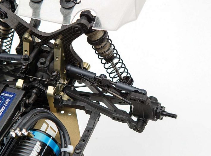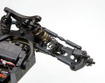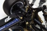 If the front suspension on the 210F looks familiar, that’s because you probably saw it in last month’s 210V3 review which is a clay surface ready buggy. The front assembly features sleek shaped suspension arms to cut through the air and offer excellent durability. A thick composite tower offers several shock and camber link locations with sturdy steel turnbuckles to adjust camber. On the caster block and spindle side of the suspension, the buggy can be built for TD’s bearing in rim style set-up or a bearing in spindle set-up for 12mm rims. The rear suspension is similar in style to TD’s prior 1/10 4WD buggies with aluminum pivot blocks with adjustable inserts to support the arms. The cool factor here are the droop screws in the arms on a 1/10 machine. The droop screws will help limit the over extension of the shocks during roll in the corners and help keep the buggy flat. The shocks are large bore units with composite