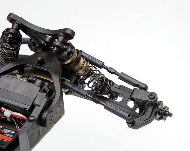 The dBoots tires proved to be grippy, I narrowed up the front wheels with no inserts and there was plenty of front end bite that really helped the buggy grab going into the corners. There was a little too much front end dive that would actually cause the car to hook going in, but after the tires broke in, there was just enough scrub in the corners to reduce the harsh reaction. There is certainly no lack in steer- ing here, it’s amazing how much bite and wheel travel this car has to rip through tight corners at almost touring car speeds.