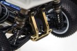 ‹Solid swinging dual bell-cranks are ball bearing supported and stuffed far up front in the buggy. The steering servo tucks in right behind the cranks and connects with a short turbuckle. Adjustable turnbuckles extend to the spindles to adjust toe.