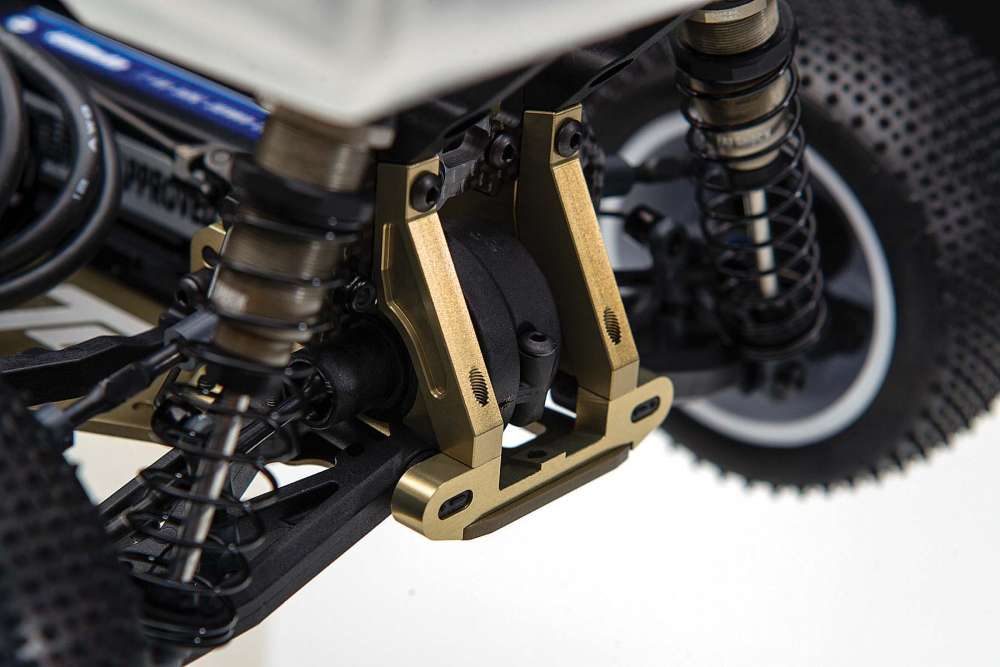 A 6061 2.5mm flat aluminum plate serves as the base with composite outer rails for bracing and to mate up with the front upper brace. The nose plate is kicked up for 2WD rake and plenty of holes litter the chassis for its adjustability between a shorty pack and a side-by-side LiPo pack. The battery in either configuration is mounted with Velcro straps.